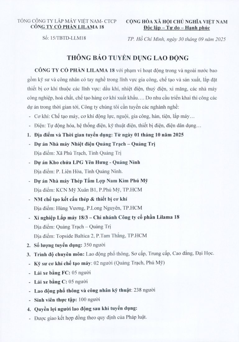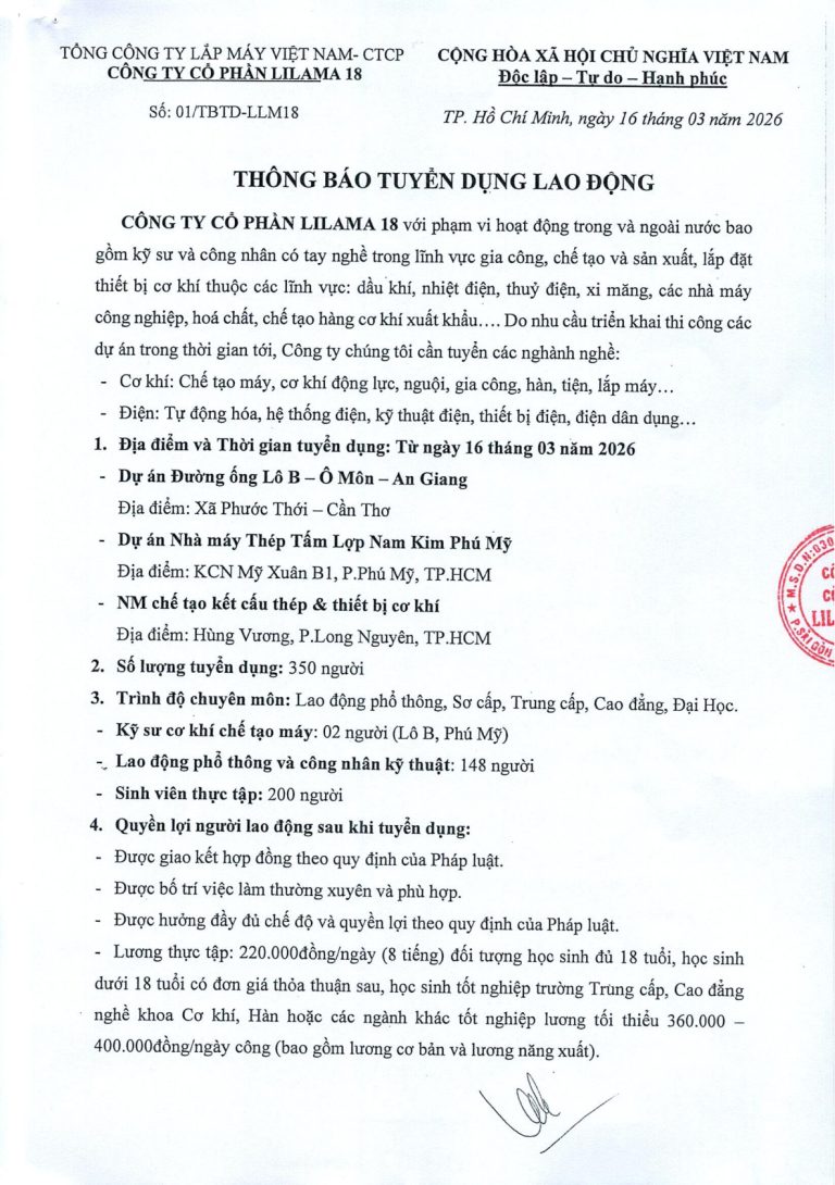 THÔNG BÁO TUYỂN DỤNG 350 LAO ĐỘNG – CÔNG TY CỔ PHẦN LILAMA 18