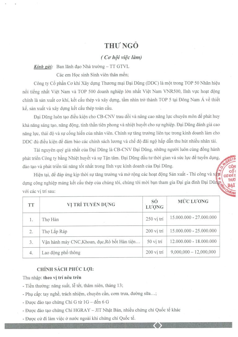 Thư Ngỏ Tuyển Dụng Việc Làm Tại Công Ty Cơ Khí Xây Dựng Đại Dũng (DDC)